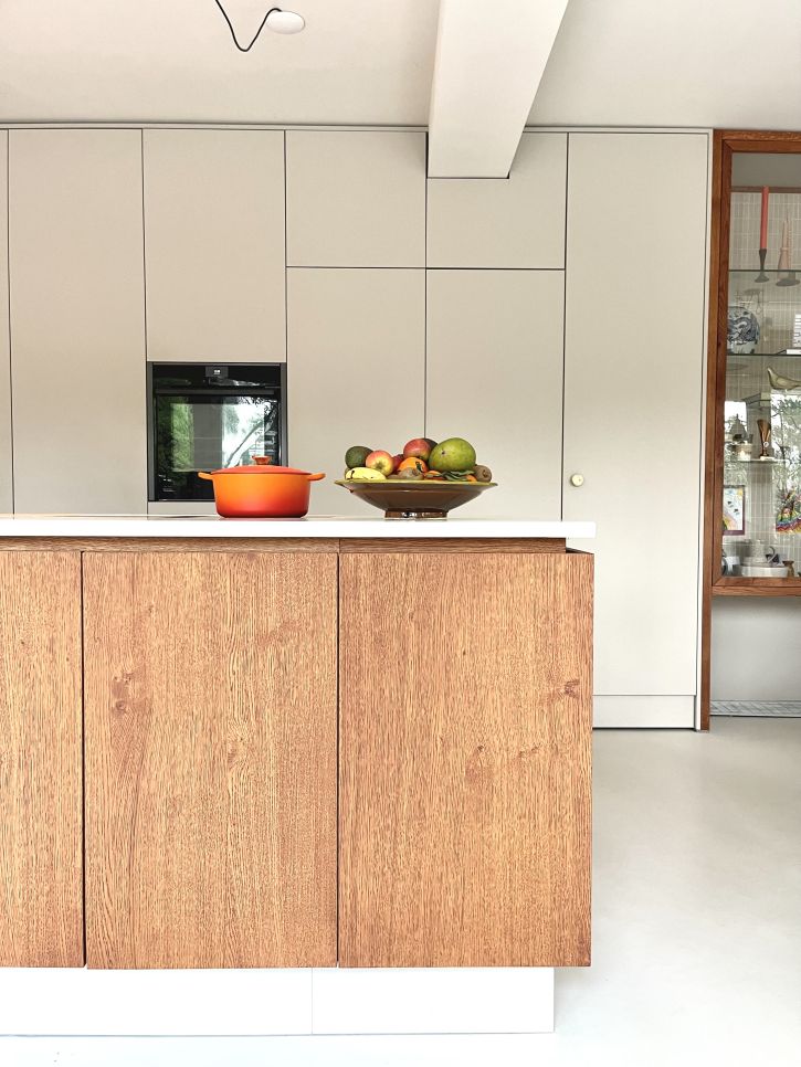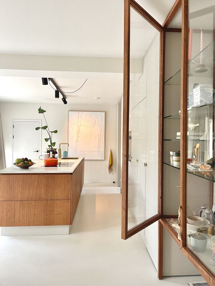 Kookeiland donker gebeitst in gelijke kleur als de vitrine in de servicewand.